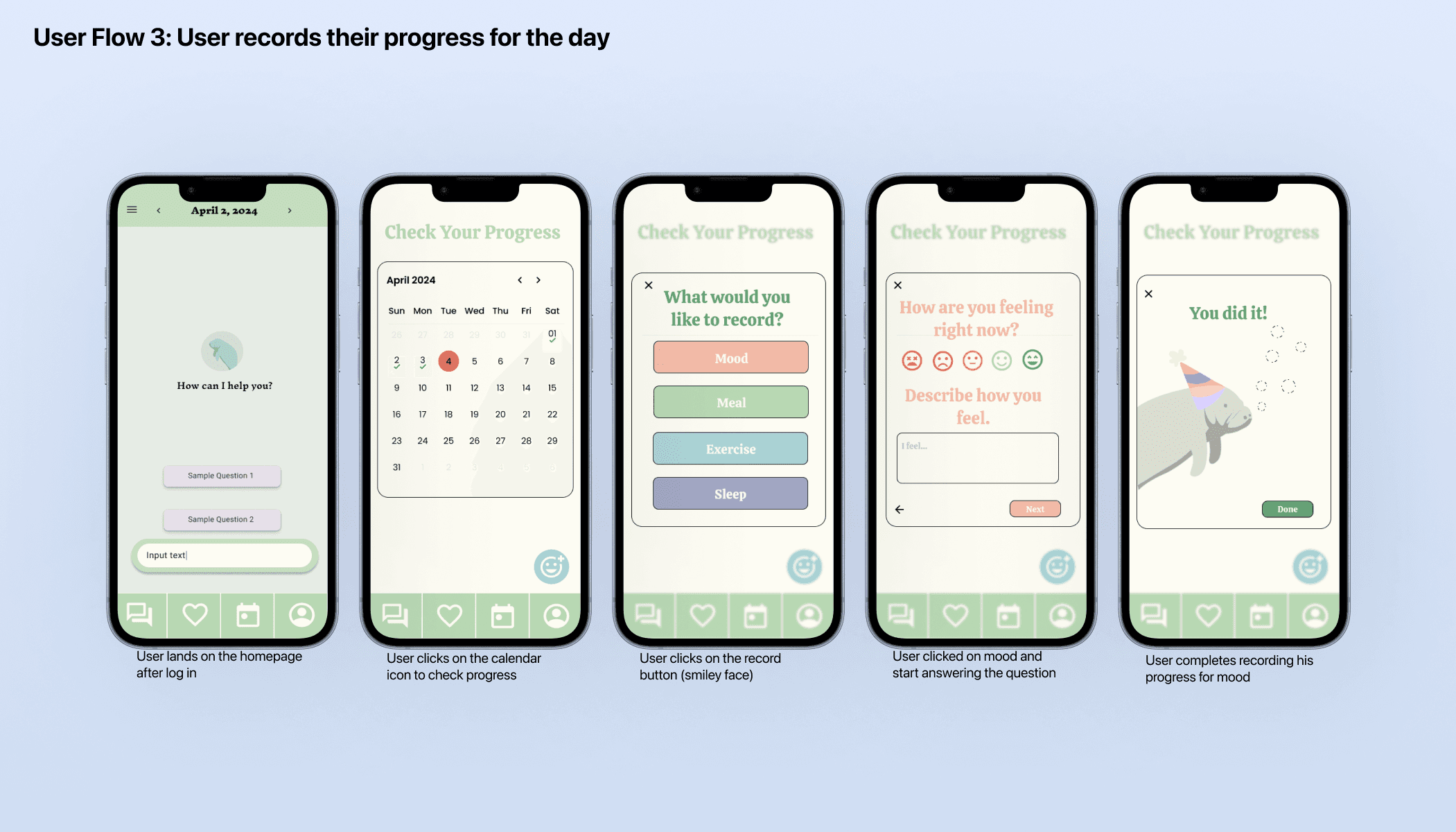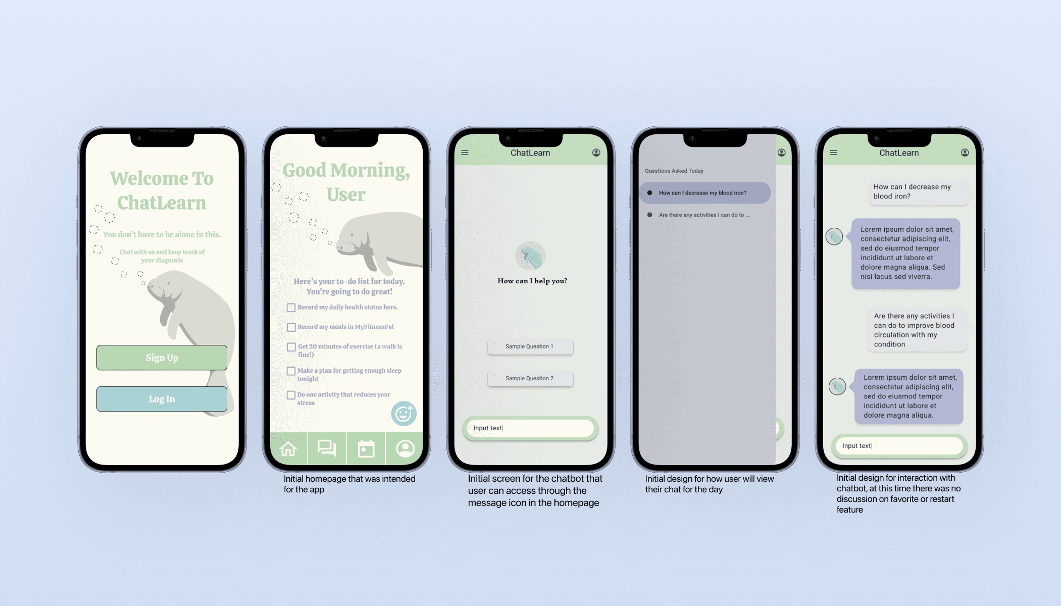 Due to timeline constraints, the final design excluded several features from the original requirements. However, we prioritized and delivered the core functionalities: user login, profile setup, a chatbot for medical questions, and the ability to record daily health progress. The interface was designed to be intuitive and straightforward, ensuring users can easily navigate the app and access key features without confusion.