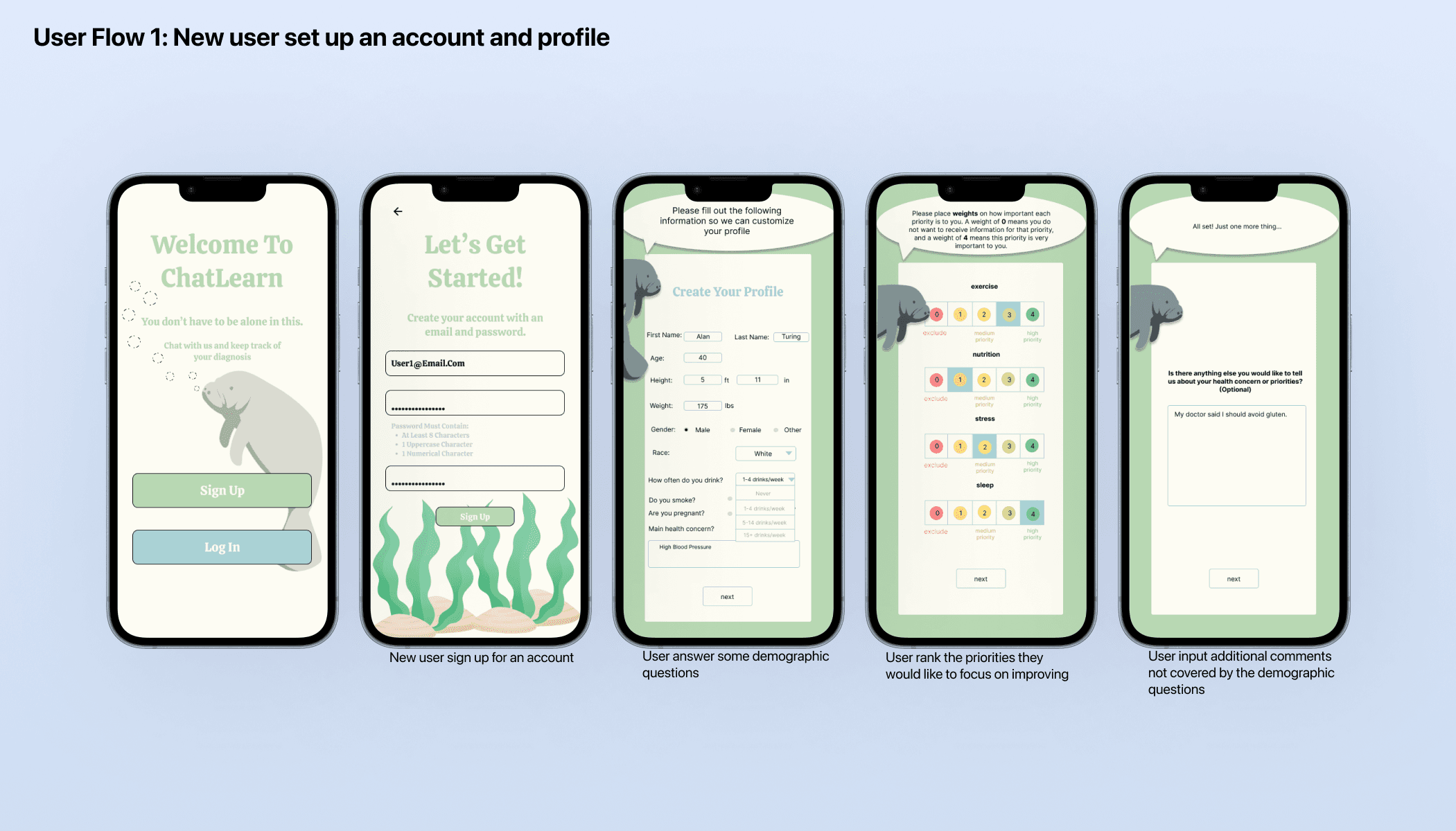 Created initial wireframes for key screens: sign-in, login, profile creation, chatbot, and progress tracking.