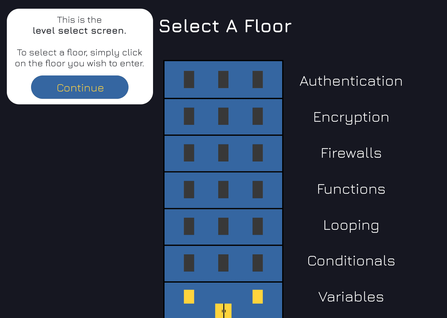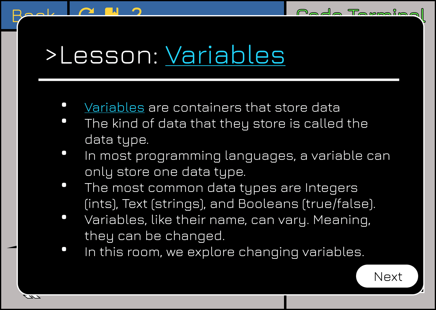 Lessons on programming concepts presented before each level